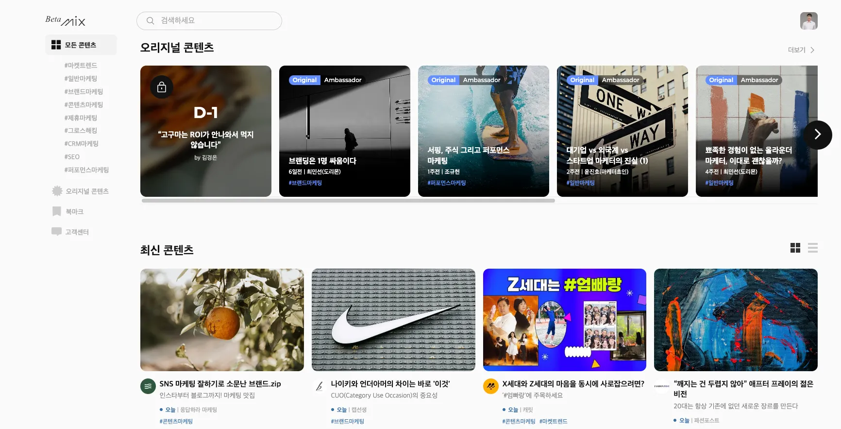 그리고 마케팅이란 시장은 변화에 빠르게 대응하고 학습할 수 있어야 최상의 퍼포먼스를 유지할 수 있는 업인데요. 업무량이 만만치 않다 보니 최신 트렌드를 파악하는데 시간을 할애하기 힘들어 하시더라구요. 그래서 MIX(서비스 이름은 미디어 믹스에서 따왔습니다)를 통해 최소한의 시간으로 알짜배기 정보만을 보실 수 있도록 구성하였습니다.
