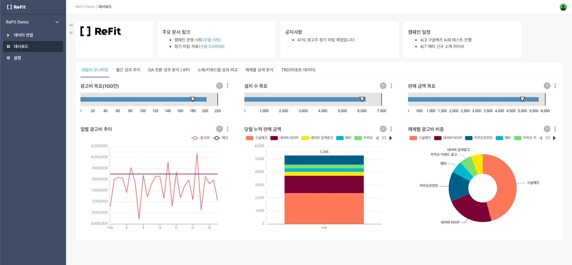 마케팅 업계가 과거 10년간 급격하게 성장하면서 수 많은 매체/전환 데이터가 생성되고 있는데요. 시장이 급성장한 것에 비해 마케터들은 엑셀이라는 무기 단 하나로 데이터 수집, 정제 그리고 리포트 작성까지 하고 있습니다. 이를 좀 더 체계적으로 관리하고 비효율적인 업무를 줄여줄 수 있는 도구가 필요하다고 생각되어 ReFit을 만들게 되었습니다. ReFit을 활용하면 광고 운영 데이터를 체계적으로 쌓고 쉽게 모니터링 할 수 있어요!