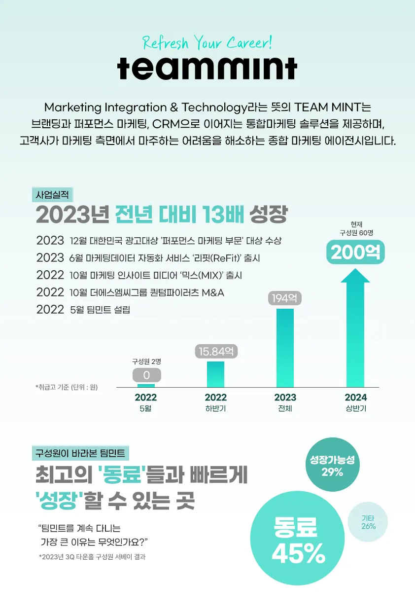 팀민트는 설립 1년이 채 되지 않은 시점에 연간 거래액 200억 이상을 확보할 정도로 가장 빠르게 성장하고 있는 광고대행사입니다. 구성원도 어느덧 70명에 달하는데요. 이처럼 단기간에 0 to 1 할 수 있는 역량과 경험을 갖춘 동료들이 팀민트에 함께하고 있습니다.