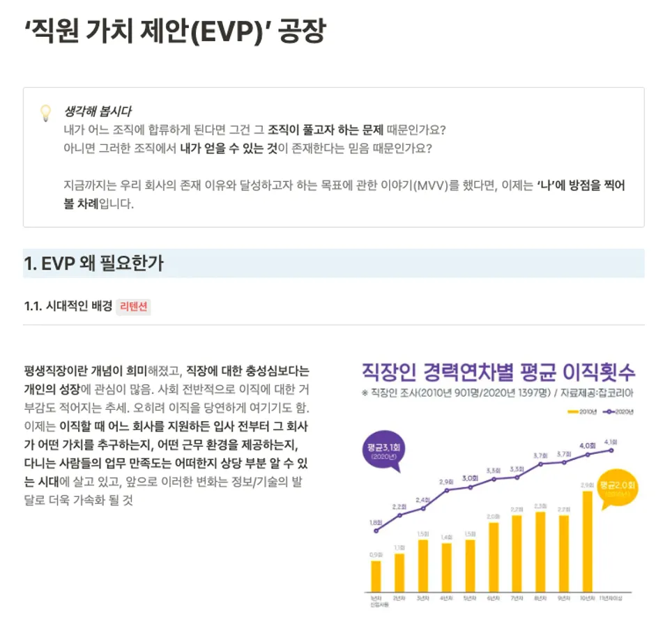 ‘조직의 성장이 곧 구성원의 성장’이라는 낙관론을 경계하고, 구성원 개인의 성향과 커리어를 고려한 가치 ‘EVP(Employee Value Proposition)’를 단위 조직 차원에서 고안해 구성원의 성장과 Career Path를 지원합니다.