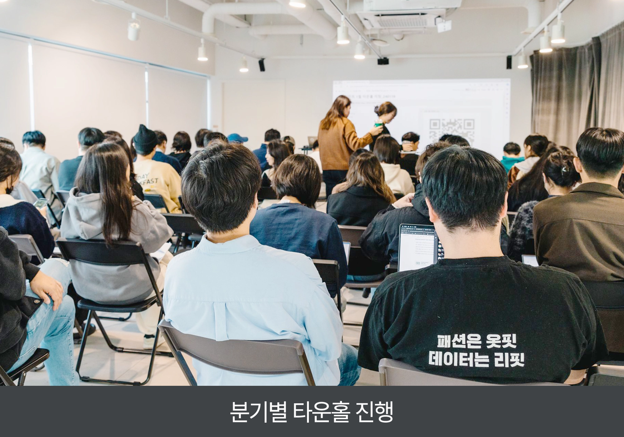 매 분기(3개월)마다 전사 타운홀을 진행합니다. 팀민트의 사업 방향, 캠페인 현황, 주요 소식, 구성원 서베이 결과 등을 전 구성원에게 공유하고, 실시간 익명 Q&A를 통해 투명하게 소통하고 있습니다.