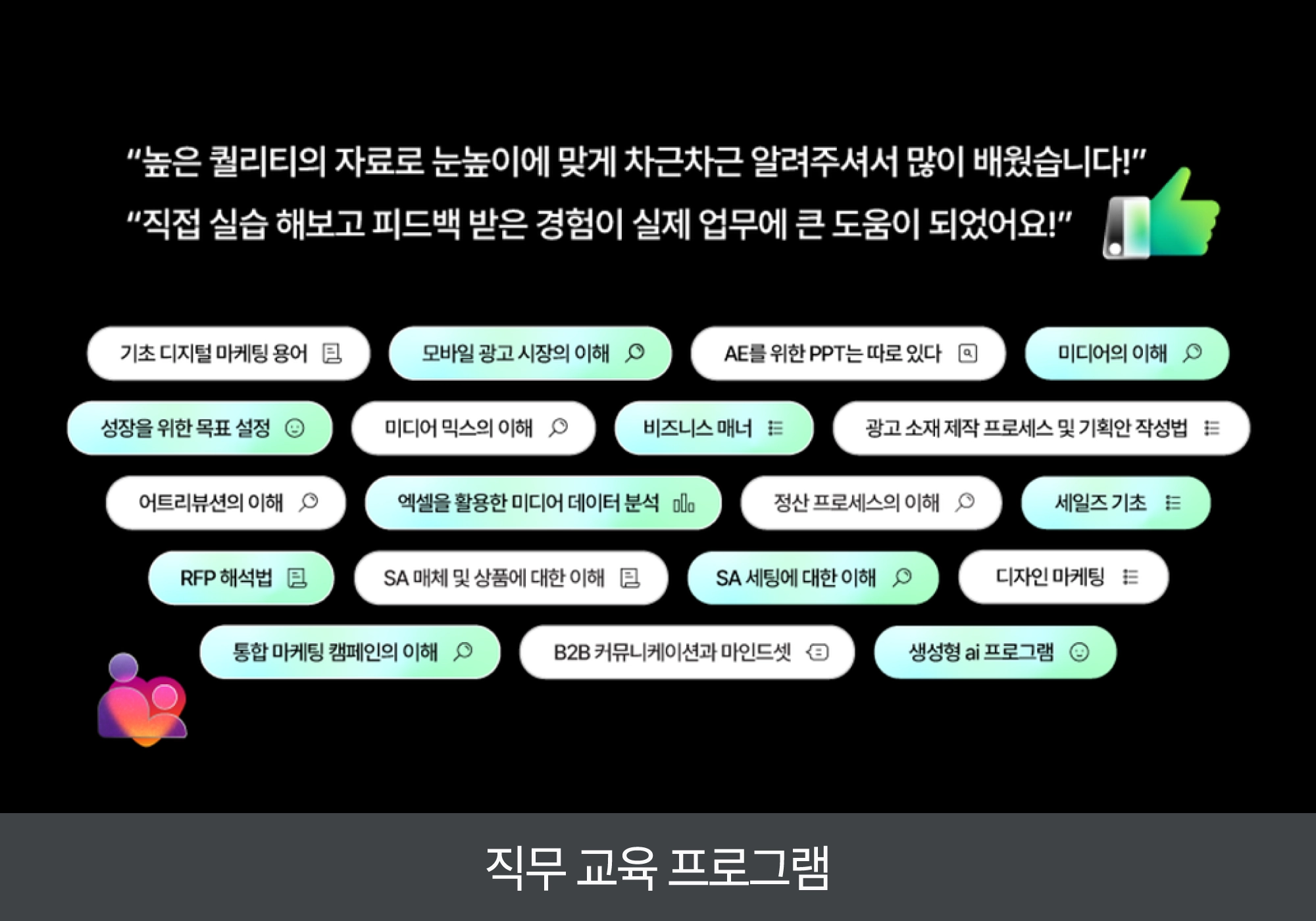 직무별 핵심 역량을 키울 수 있도록, 교육 커리큘럼을 바탕으로 온/오프라인을 통한 사내 직무 교육 프로그램을 운영하고 있습니다.